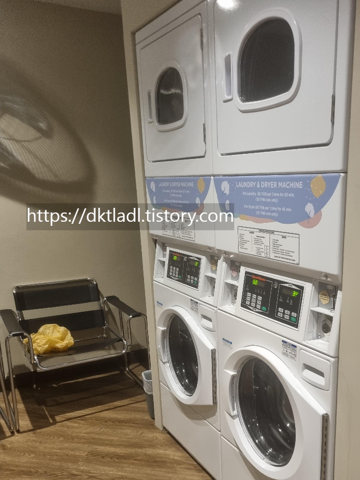 세탁기 사용은 60바트 25분 필요, 건조기는 60바트 45분 필요합니다.